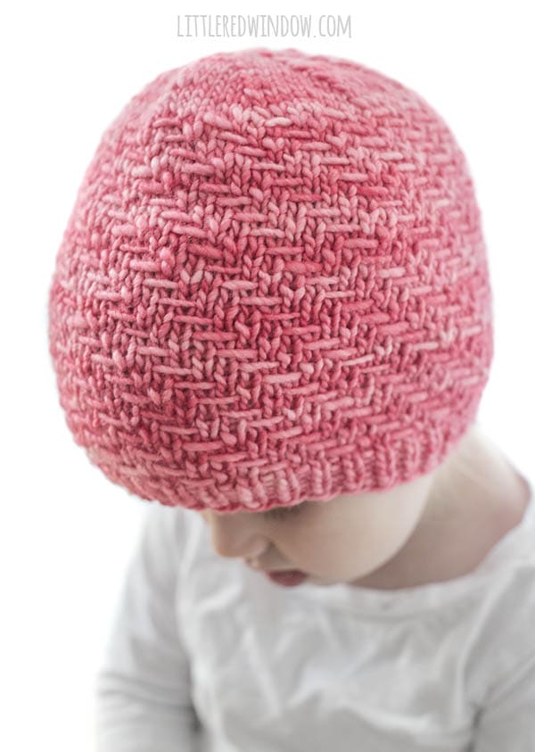 This gorgeous diagonal weave hat knitting pattern looks almost like a complicated herringbone stitch but it’s actually really simple and knits up into a gorgeous hat for babies or toddlers!