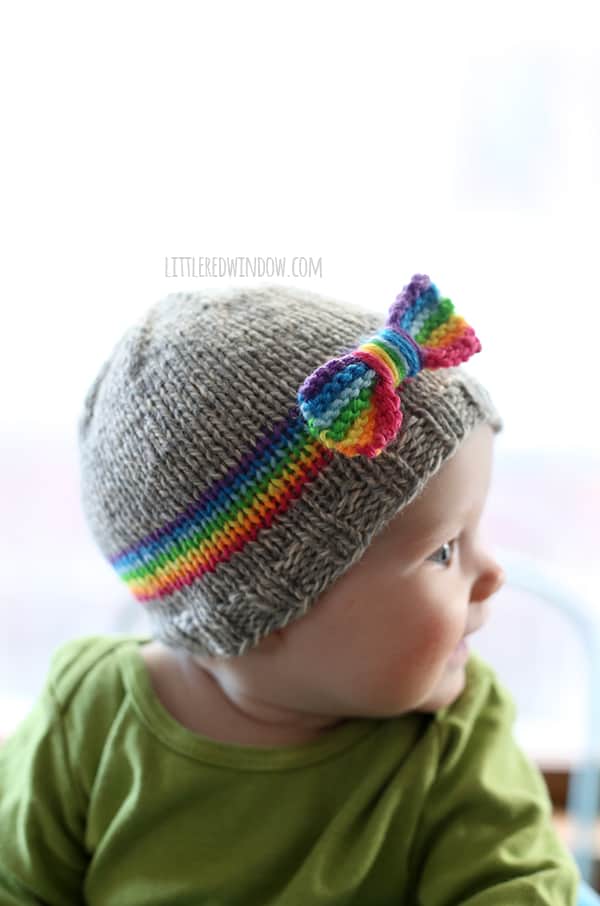 Knit your little one a sweet rainBOW baby hat including rainbow band and bow with this adorable knitting pattern!