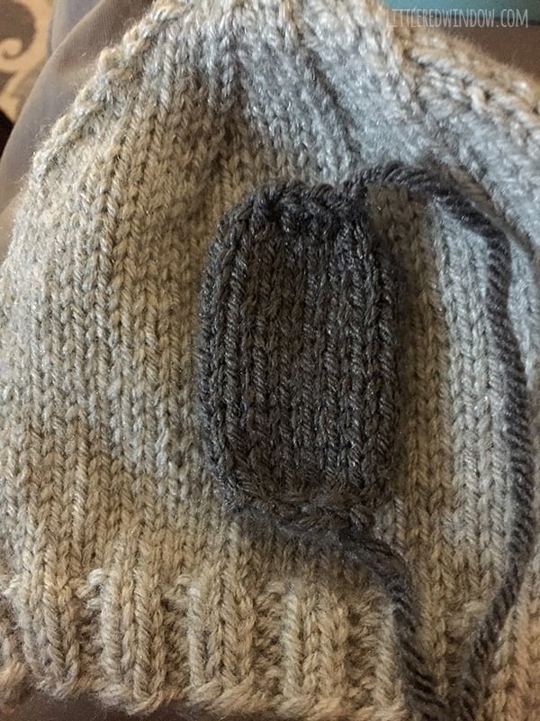 Using double pointed needles as straight needles, cast on 12 stitches with the light gray yarn. Leave a long cast-on tail to stitch the ears to the hat.