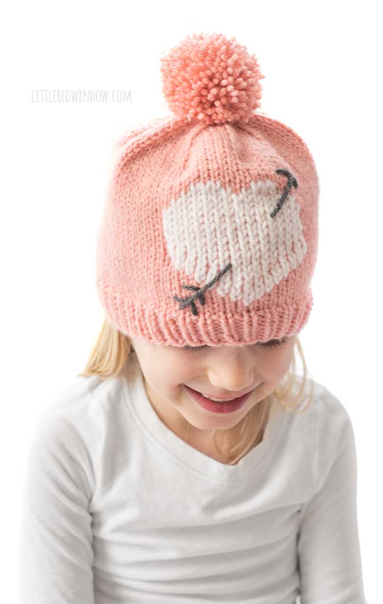 This classic Valentine’s Day hat pattern, the Cupid’s Heart Hat knitting pattern features a duplicates stitch classic heart shape with Cupid’s arrow through it!