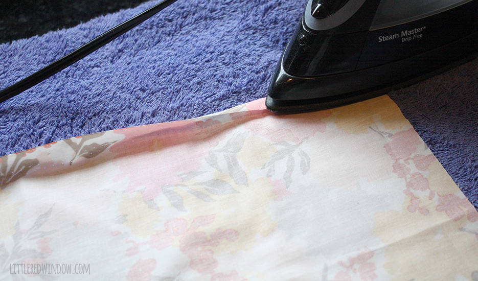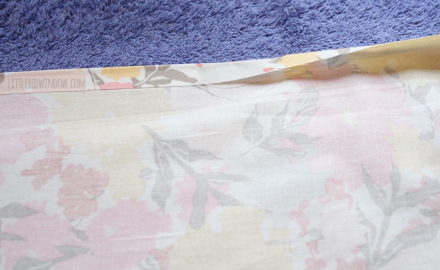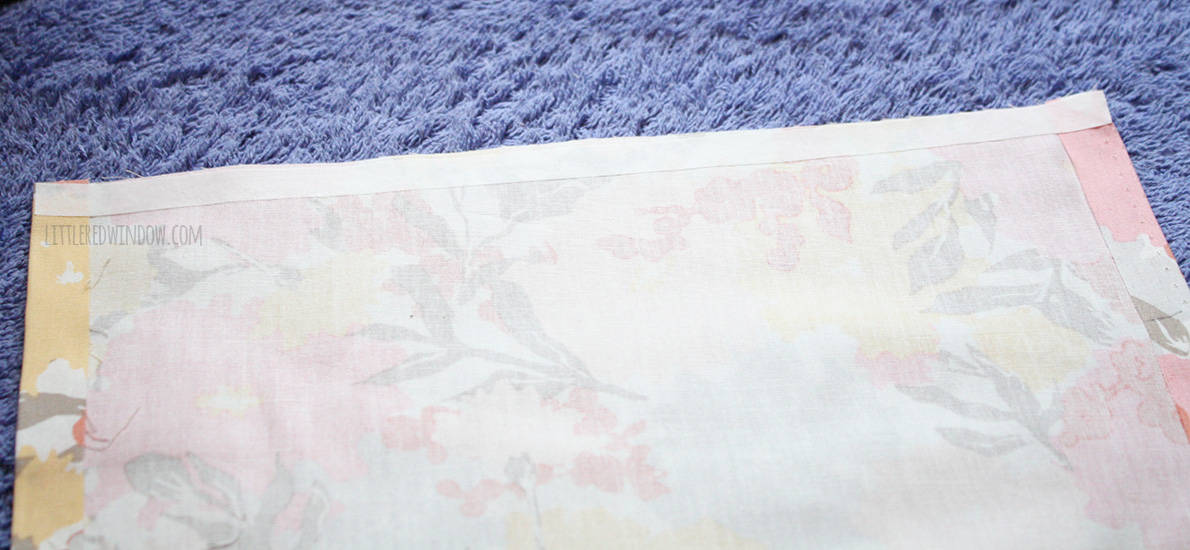 First, starting with the long sides, iron the hem tape close to the edge of the fabric. Leave the paper backing on for this step.