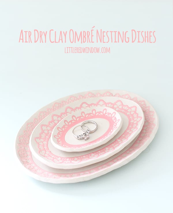 So I randomly grabbed these pretty ombre scrapbook stickers at the craft store a few weeks back. If you you open them up, they’re actually made of some kind of rubbery material with a sticky back. They’re not paper. I had no plans for them. Until one day I saw them sitting next to a new package of clay I ordered and a lightbulb went off. You see, I have a thing for nesting dishes. They’re just so cute and adorable and pretty! I do not, however, have a thing for the price of nesting dishes. I always get so excited when I see them on Etsy or in a store and then I peek at the tag and have a heart attack. I mean, I get that they’re a lot of work to make, but geesh! So I came up with a crazy plan to make my own. I thought they’d look cute sitting on my dresser. Enter the air dry clay. It’s probably not as sturdy as the kind of clay you bake in the oven, but you know what? It’s easier to deal with. And there are no stinky oven fumes. So that’s what I went with. The last time I used air dry clay, I used a different brand and, let me tell you, this brand is so much better. That’s my official review. And here’s how I made these pretty Air Dry Clay Ombré Nesting Dishes!