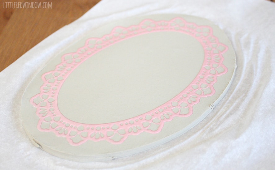 3. I tried this multiple ways including leaving the scrapbook sticker on its backing and planning to stick it on when the dish was dry, but, surprise! Turns out the best method is to just stick the sticker right onto the wet clay! Gently press it into the clay with your fingers4. Cut around the sticker, leaving a small border, with your knife or clay tool.5. Remove extra clay from around the edges. 6. Using your fingers, gently, gently start to go around and bend the edges of the dish upwards. This will take some time to get it even all the way around. This pic is just as I was starting to do that.7. When your edges are shaped, used a tiny bit of water on your fingers and smooth out any rough spots. 8. Allow your dish to dry according to the package directions. Mine took about 24-36 hours. Repeat with the other sizes of scrapbook stickers to make three nesting dishes.