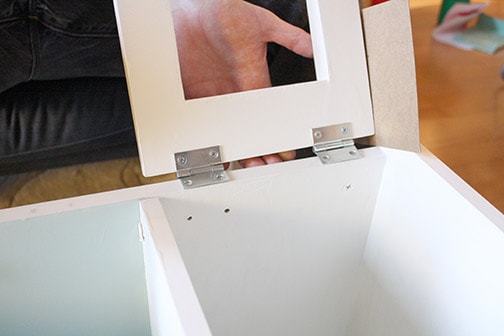 Then we held the doors up and marked and drilled for the hinges on the front edge of the nightstand body.