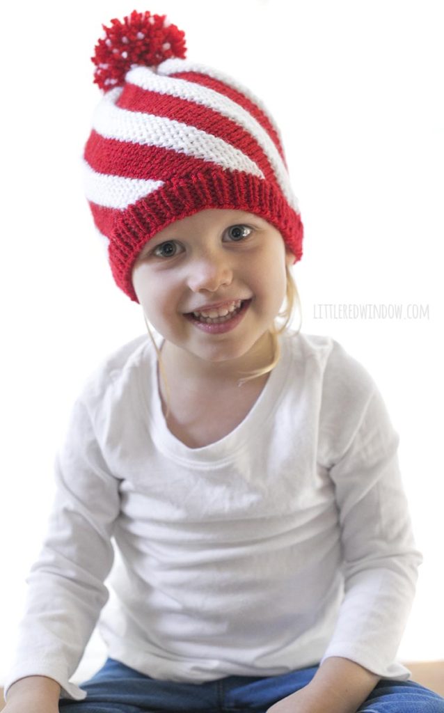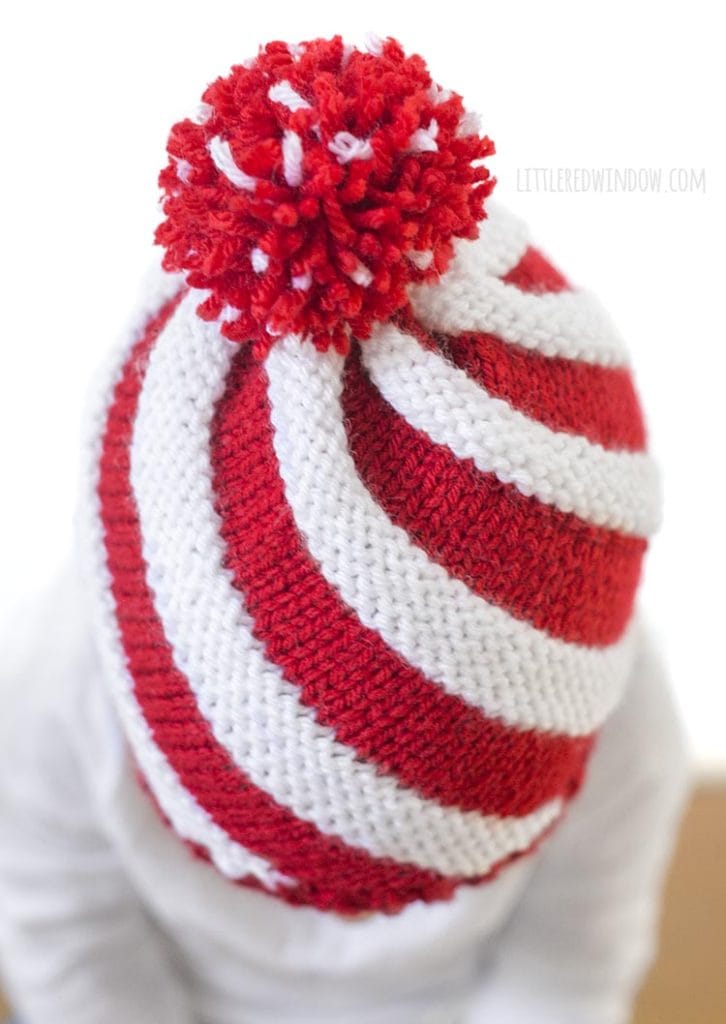 This fun peppermint twist hat knitting pattern has bold red and white stripes swirling up to a cute speckled pom pom on top, just like a peppermint candy!
