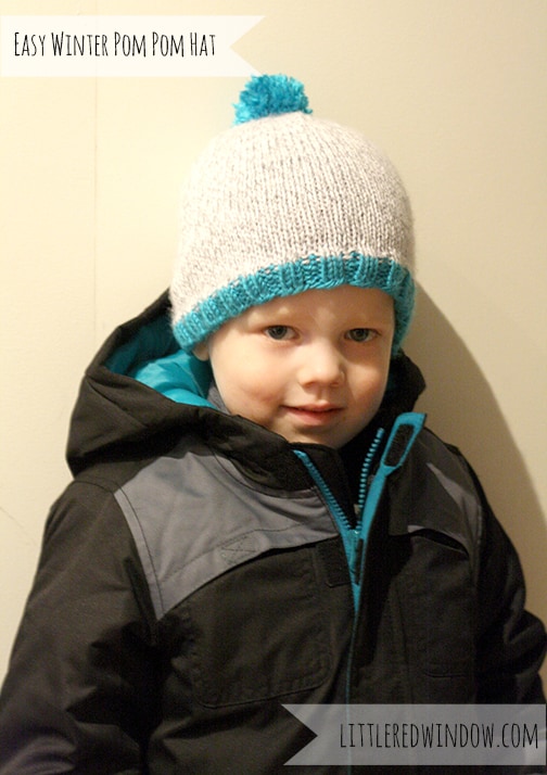 His coat this year is dark gray with black and blue so I picked some soft heathered gray yarn and bright blue, both leftover from other projects. The pattern is basically the same as my Baby Bear and Apple hats, just a larger size for a giant three year old head. And of course there’s a pom pom because they are adorable on little kids!